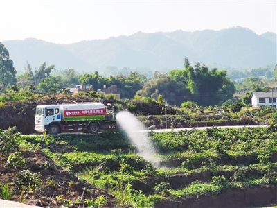郭正祥说,因持续干旱,临江镇兴隆村、天星村、天堂村、普安村等地山坪塘水量减少,人畜饮水逐渐困难,果园、水稻存在减产风险。面对严峻旱情,中国水电十四局渝西水资源配置工程项目部立即行动,抽调12名同志组成抗旱应急工作组,投入138万元新建提水泵房和蓄水池,每天上午用洒水车帮助果农对果园进行浇灌。近1个月来,工作组陆续在天星村、兴隆村、天堂村、普安村等地帮助村中果园抗旱、给村民送水,希望降低持续高温干旱带来的经济损失。