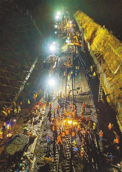 9月1日凌晨,重庆铁路枢纽东环线磨心坡站,中铁八局作业人员正在抓紧完成最后的施工。5时,“三线枢纽”磨心坡站开通运营,标志着东环正线主体工程接入襄渝线全部完成,为东环线与既有襄渝线、襄遂联络线正式“接轨”创造了条件。