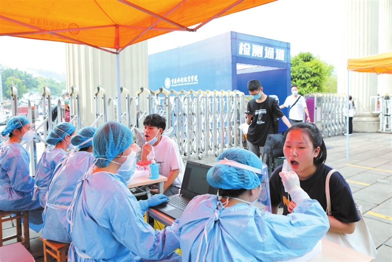 报到现场,新生们有序进行入校核检、扫“场所码”、行李消毒、体温检测、现场核酸检测采样等。同时,该校还组织志愿者为新生答疑解惑、引导新生、协助新生完成入学手续,帮助学弟学妹搬运行李。渝西都市报记者 陈仕川 摄