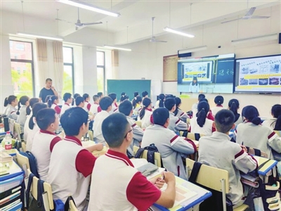 在屏幕对面进行教学的正是重庆市第八中学校的资深历史教师,本次历史课是实验中学和重庆八中同步开展的“双师课堂”。八中课堂的教学图像、声音、文字、图片、多媒体动画、视频材料等通过卫星和5G技术实时、全程直播到实验中学宏帆初中班和树人高中班,让学生可以异地、实时、原汁原味享受和八中学生完全相同的课堂教学。