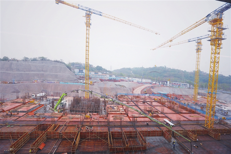 近日,永川区中医院凤凰湖分院第二期项目建设现场,塔吊林立、机器轰鸣,一派繁忙景象。