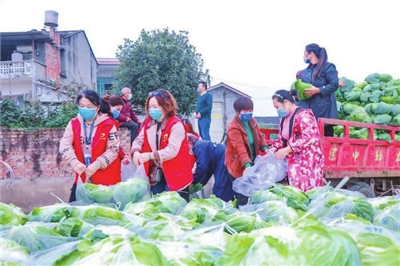 当天下午2点,桂林街道小舟村的蔬菜种植基地一片繁忙,身穿红马甲的企业家志愿者正将一颗颗白菜打包装袋,一旁的工人们则将打包好的白菜搬运上车,准备运往重庆主城。
