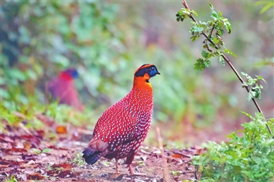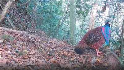 据了解,红腹角雉隶属于鸡形目稚科,为国家二级保护野生动物,体型和家鸡差不多,因其头部肉质角而得名“角雉”。雄性成鸟羽色鲜艳,额部黑色,头、颈后部和上胸橙红色,脸部裸皮蓝色,尾羽近黑色,其余体羽以棕红色为主,并布满白灰色斑点;雌性成鸟体型较雄性娇小、羽色暗淡。红腹角雉常栖息在海拔1000至3500米的山地阔叶林、针阔混交林和针叶林中,以树木的嫩芽、嫩叶、果实和种子等为食,国内主要分布于四川、贵州、云南、西藏等地,国外分布于印度、缅甸、越南等。