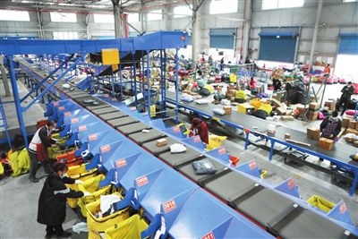 本报讯(渝西都市报记者 陈仕川 文/图)12月4日,位于永南物流园的重庆永川快递智能分拨中心,进库快件经输送带消毒后源源不断地进库,智能分拣设备分拨快件,80多名工作人员则忙碌地装运快件。目前,该中心日均分拨快递12万余件。