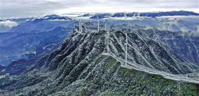12月2日,万盛经开区石林镇茶园村南天门风力发电场,降温天气造就了雾凇景观,将漫山遍野的植被变为“玉树琼枝”,与巨大的风力发电机组共同构成一道冬日南国雪原风景。