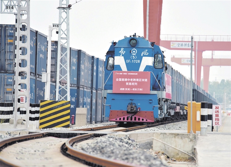 成都日报讯 (胡兵发 成都日报锦观新闻记者 陈方耀 王丹 文/图) 3日是中老铁路开通运营一周年,在成都(双流)空铁国际联运港,一列满载电动自行车、石材、瓷砖、灯具等出口商品的国际货运列车从这里出发,前往老挝首都万象。