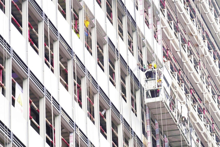 连日来,北碚区有力有序推进民生工程项目,12月3日,在解放路停车楼施工现场,中铁二十二局五公司的工人们正忙着幕墙施工和停车设备安装调试(大图)。据悉,该项目总建筑面积约17000平方米,设计停车位450个,充电桩车位54个。工程目前已进入最后的冲刺阶段。