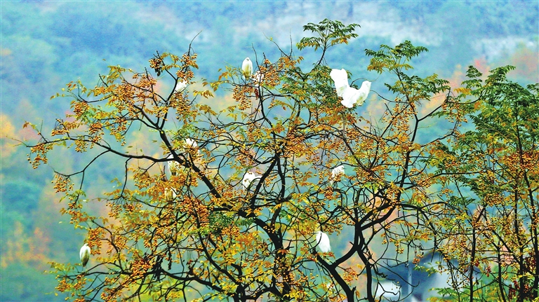 12月1日,万盛经开区万东镇新田村,一群白鹭在树枝上翩跹栖息,与斑斓的冬日美景相映成趣,共同组成一幅生态画卷。