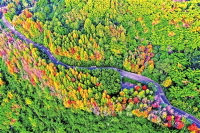 近日,万盛经开区万东镇方家山森林运动公园,道路两旁层林尽染,山间景色美不胜收,生态美景一路相伴。