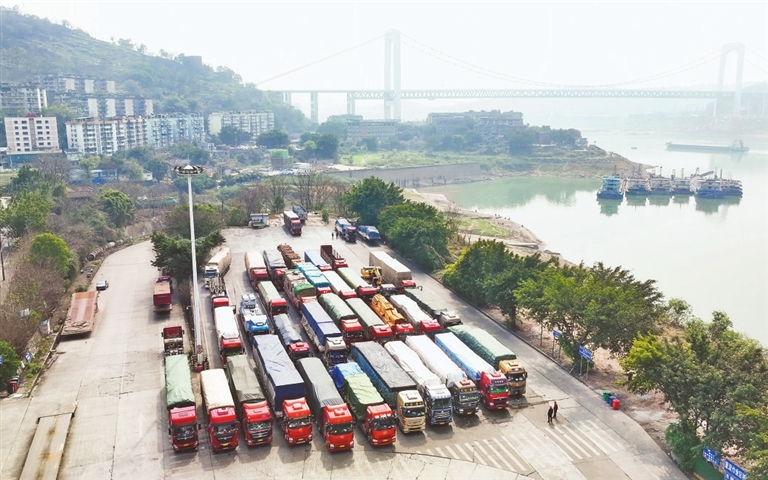 ▲2月19日,等待坐船前往长江下游城市的大货车排满郭家沱滚装码头。