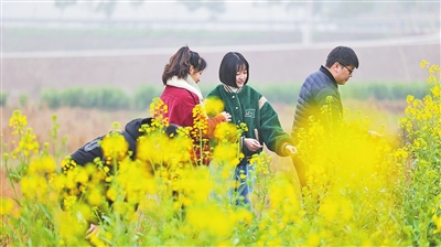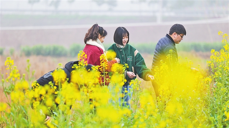 花开时节,荣昌区万灵镇大荣寨社区柳乃夫小院旁的连片油菜花迎风绽放。春风吹过,花浪翻滚,黄灿灿的油菜花错落有致地重叠在一起,恍惚间好像走进了一幅油画里。游客们流连其中,赏花、拍照,温馨惬意。