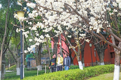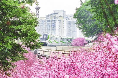 ①渝中半岛春意盎然,在轨道交通2号线佛图关段,“开往春天的列车”穿行花海。