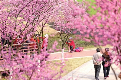 ②江北嘴中央公园的樱花竞相开放,吸引了许多游客前来游玩,享受美好春日时光。