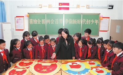 图为红旗小学党员老师给四(4)班学生普及全国“两会”知识。