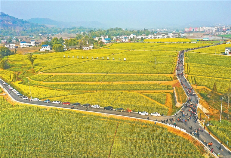 阳春三月,正是赏花好时节。在广安市广安区花桥镇,万亩油菜花尽情绽放,目之所及宛如一片金色海洋,将乡村田园装扮成一幅金灿灿的图画,吸引四面八方的游客前来踏春赏花,带动乡村旅游发展。
