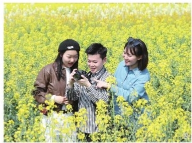 ②图为游客在油菜花海里拍照。