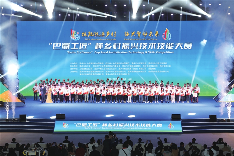 据了解,本次大赛由重庆市人力社保局、四川省人力社保厅、重庆市乡村振兴局和重庆市永川区人民政府共同主办,实现了“技艺展示、技能体验、产品展销”多元融合。三大赛场观摩超过3.5万人,36家企业参与乡村振兴特色产品展览,207名小学生到赛场参加劳动教育专题课程感受技能魅力。大赛还得到五粮液集团公司、重庆轨道集团等8家赞助企业、25家技术支持单位以及近300名志愿者的大力支持。