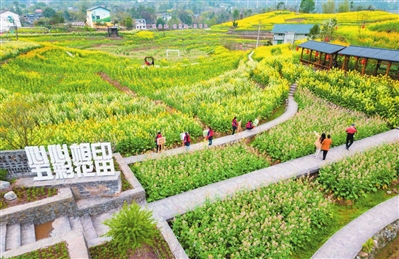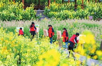 近日,南川区鸣玉镇在向家沟乡村振兴示范长廊打造的五彩油菜花田迎来了油菜花盛放期,不仅吸引不少游客前来赏花游玩,还引来学生在油菜花间绘画,感受春满乡村的魅力。南川日报 特约通讯员 罗川 摄 据《南川日报》