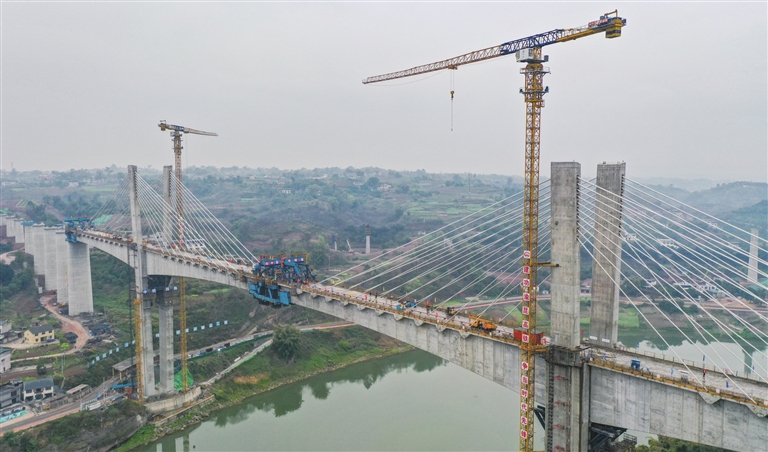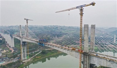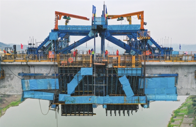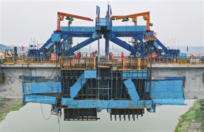 3月18日在四川省泸州市拍摄的渝昆高铁泸州沱江特大桥主跨合龙施工现场(无人机照片)。
