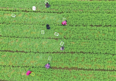 3月19日,四川省眉山市东坡区太和镇永丰村,村民在“稻菜轮作”田里采摘豌豆尖(无人机照片)。
