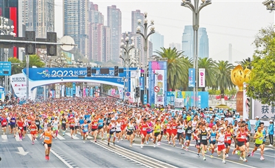 ①3月19日,南岸区南滨路,2023重庆马拉松在海棠烟雨公园鸣枪开跑。