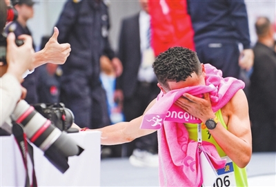 ②重庆本地选手李波冲过终点后喜极而泣,一旁的观众为他竖起大拇指。比赛中,李波以2小时13分20秒的成绩打破个人最好成绩,第六位冲线。