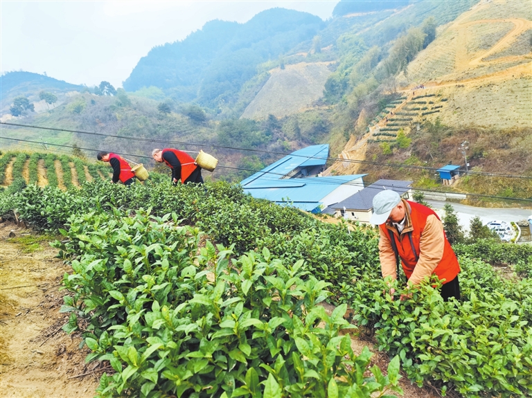 春雨过后,茶芽萌发。近日,永川区宝峰镇组织工会会员和身着“宝峰蓝”、红马甲的志愿者,来到泸永桥村种茶大户的基地帮忙采摘茶叶。