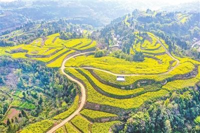 阳春三月,油菜花开。3月14日,大足区宝顶镇铁马村的千亩油菜花田里花团锦簇,清香怡人的油菜花香引来蜂飞蝶舞,构成一幅美不胜收的春景图。