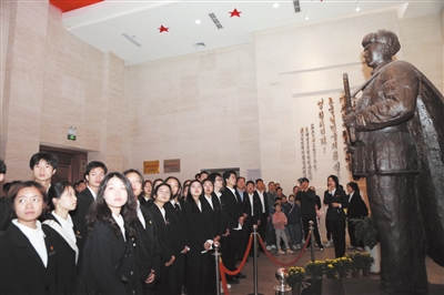 图为全体党团员在邱少云烈士事迹陈列馆聆听邱少云烈士的英雄事迹。