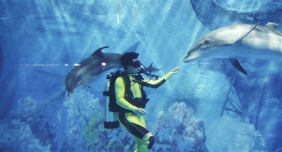 图为饲养员在水中与小海豚嬉戏。渝西都市报记者 陈仕川 摄