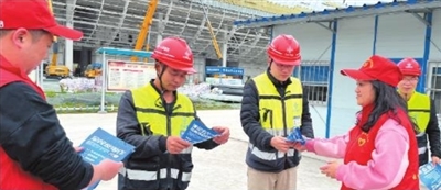 4月10日,永川城市发展集团有限公司干部职工走进会展中心工地,开展全民反诈、大巡逻、大排查、大整治等平安建设宣传活动。