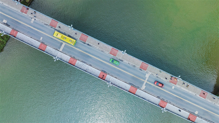 图为近日俯拍的綦江大桥,桥上黄、绿、红三个颜色的车辆依次行驶。在碧绿的河水映衬下,大桥显得格外美丽。
