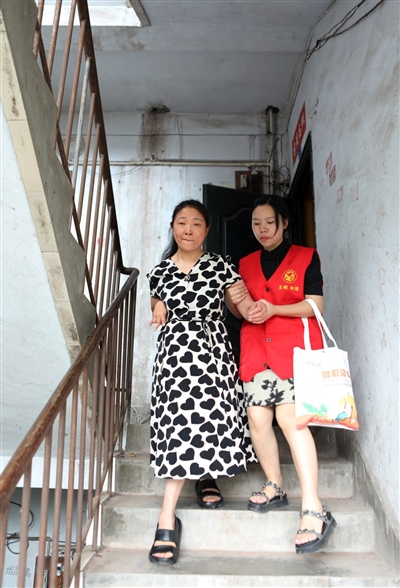 图为板桥社区专职网格员搀扶残疾群众下楼。