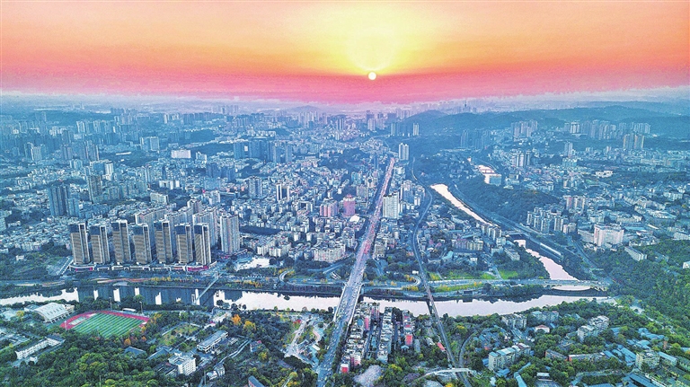 日落时分,夕阳余晖渲染天边,美丽光影与绕城而过的釜溪河交相辉映,展现出城市之美。