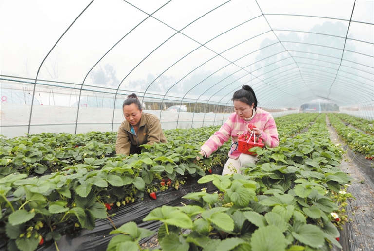12月13日,在永川区南大街街道代家店村代家草莓园的草莓大棚,一垄垄草莓长势喜人,绿油油的叶片下挂着鲜红色的果实,卢洪刚夫妇带着务工人员正忙碌着采摘、分拣、包装。同时,在大棚内忙着采摘草莓的,除了卢洪刚夫妇,还有迫不及待赶来尝鲜的市民,体验着采摘乐趣。