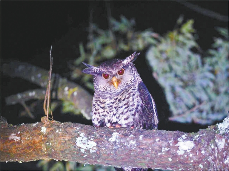 林雕鸮是一种大型鸮类,为夜行性动物,白天通常藏在茂密的树枝、树叶丛中休息,黄昏时才开始活动和觅食。野生林雕鸮种群数量极为稀少,在重庆地区十分罕见,属国家二级保护野生动物。