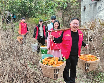 在一片挂满沉甸甸金灿灿果实的树下,青年志愿者有的采摘、有的分拣、有的搬运。短短半天时间,李远书家900斤血橙便采摘一空。