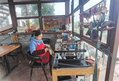 今年50岁的村民甘遐学曾在皮鞋厂工作,随着艺术院落建成,她留在家乡工作,还拾起在皮鞋厂工作的老本行,成为一名“皮革艺人”。