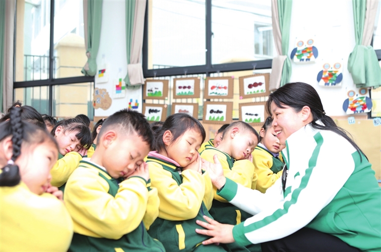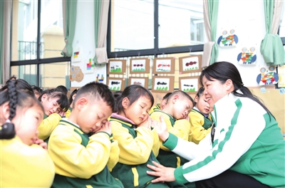 图为老师向孩子们讲解正确的睡姿。