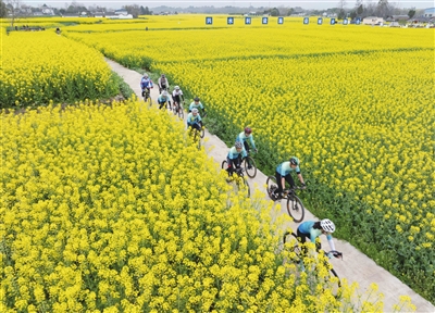 3月17日,在四川省绵阳市安州区秀水镇,骑行爱好者穿行在千亩油菜花海中。