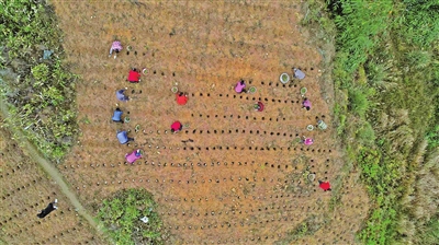 3月19日,在綦江区赶水镇石房村玉米基地,记者看到20多名农户正在有序劳作,起苗、打窝、施肥、栽苗……大家按照行距要求将玉米种苗放入定植穴窝,并覆盖一层泥土固苗。不久,一排排玉米便移栽完成,绿油油地铺满田间。
