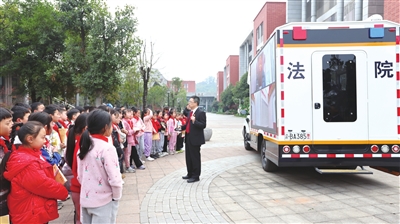 3月27日,永川区人民法院民二庭将车载法庭开进萱花小学、五洲小学,给同学们送上生动的普法微课。