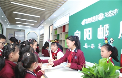3月27日,永川区红旗小学文昌路校区“向阳邮局”在喜庆的氛围中开业,“向阳邮局”首任小学生局长和营业员认真为同学们办理信件邮寄业务,盖邮戳发首日封信件等(如图)。