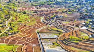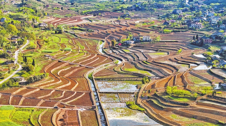 3月25日,万盛经开区南桐镇沙坝村,新建的梯田层层叠叠,与村庄相映成趣,构成一幅美丽的乡村田园画卷。