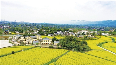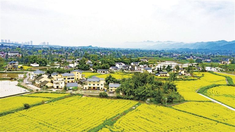 阳春三月,行走在大足区拾万镇长虹村,金黄的油菜花与蓝天青山相映成趣,座座白墙黛瓦的民房掩映其中,房前屋后花繁叶茂,墙体雕塑和绘画充满田野风情,三五游人正徜徉其间,体验着自然悠闲的和美乡村。