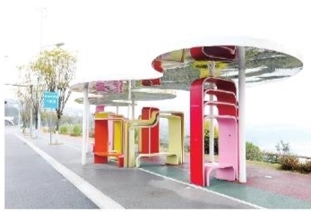 “如歌的日子”公交车站位于悦来美术馆旁的悦城路站,以生活中常见的板凳为元素,蓝色和红色两个硕大的板凳高低错落为等车的乘客提供了有趣的休息空间,旁边紧紧围绕着17个小板凳色彩绚丽,与悦来美术馆遥相呼应。