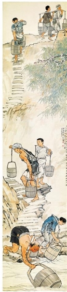 《巴人汲水图》以高度概括的手法,将巴人传统汲水的宏大场面分解为舀水、让路、登高前行3个段落,描绘出7个不同人物,神韵灵动、寓意深刻、意义深远。