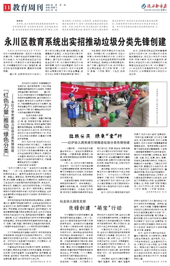 本报讯(渝西都市报通讯员 邓常莲)垃圾分类就是新时尚!自垃圾分类先锋创建以来,为提升学生的环保意识和垃圾分类能力,永川区教委在全区各级各类学校深入开展垃圾分类先锋创建活动,多举措推动垃圾分类从娃娃抓起,通过实践活动和宣传教育,营造良好创建氛围。