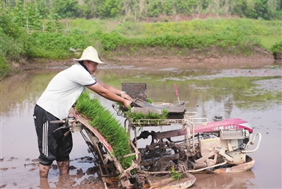 “加油干,还剩最后一两处田还没插秧了。”说完,张承龙便甩掉脚上的拖鞋,戴上一顶草帽,轻轻一跃来到田里,躬身弯腰利索地操作着手扶式插秧机,将一株株嫩绿的秧苗整齐地插入田里。