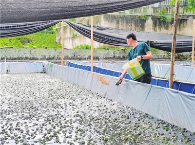 潼南报讯(全媒体记者 陈俊霖 罗昌泽)“呱呱呱……”未见牛蛙,先闻蛙声。一只唱,只只唱,蛙声此起彼伏。近日,记者走进潼南区大佛街道卫星社区鲲程牛蛙养殖基地,养殖池依次排开,黑色的遮阳网下,水池中的牛蛙或静静地潜伏在水里,或悠然地游动着,每当有人经过,它们便四散开来,充满活力。